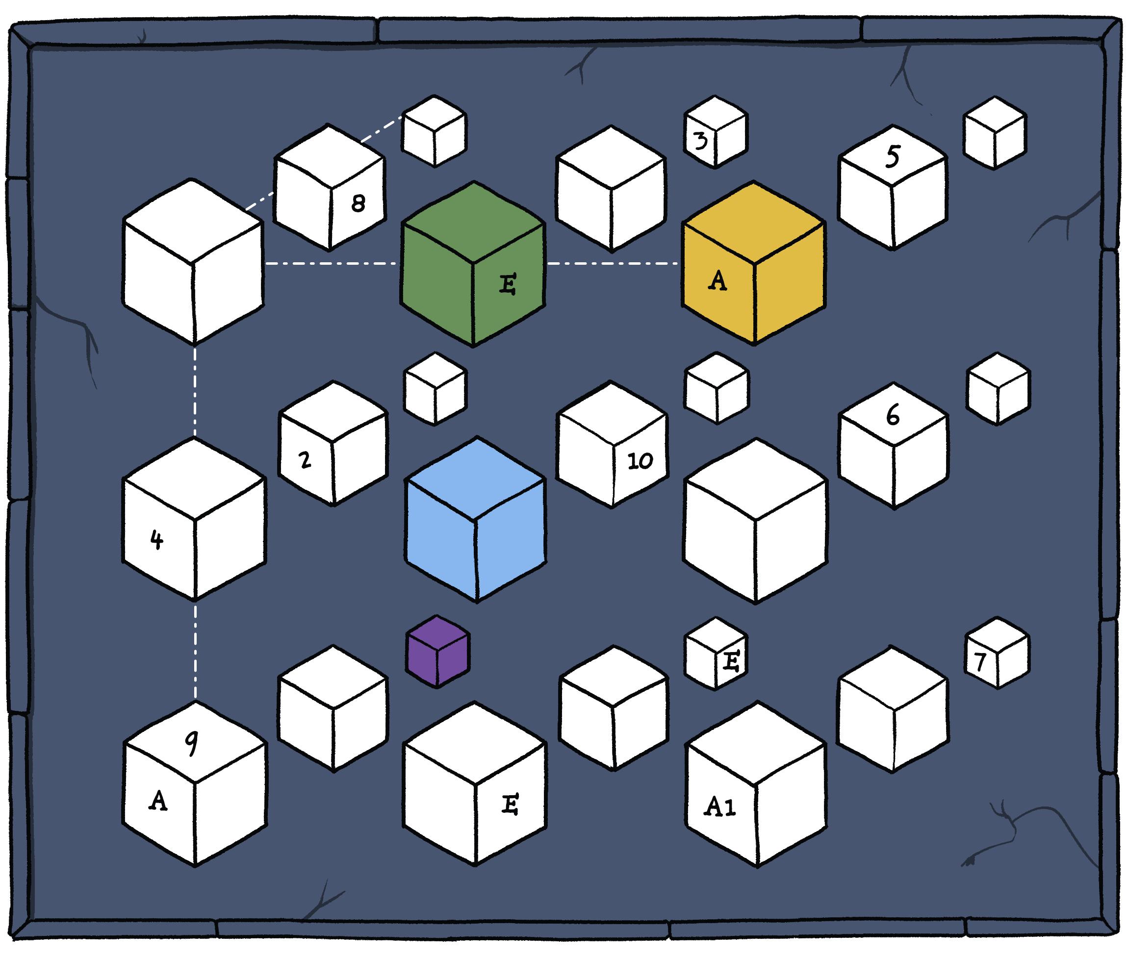that each cube displays its own unique string, all of the same length. On the walls, an inscription seems to