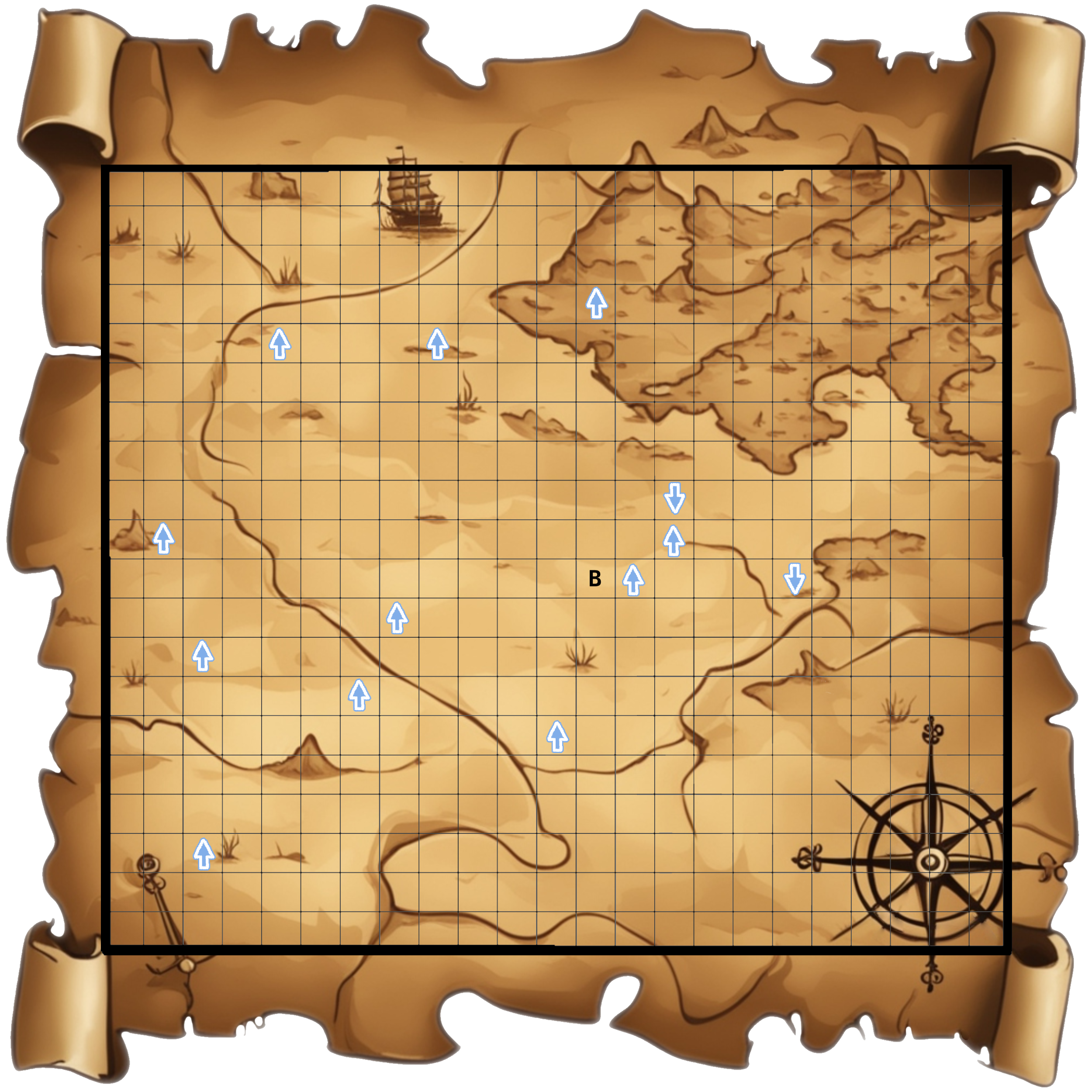 - Each stream bubbles up from the ground from a particular location (marked with a blue up arrow) and sinks back into the ground at a separate location (marked with a blue down arrow).