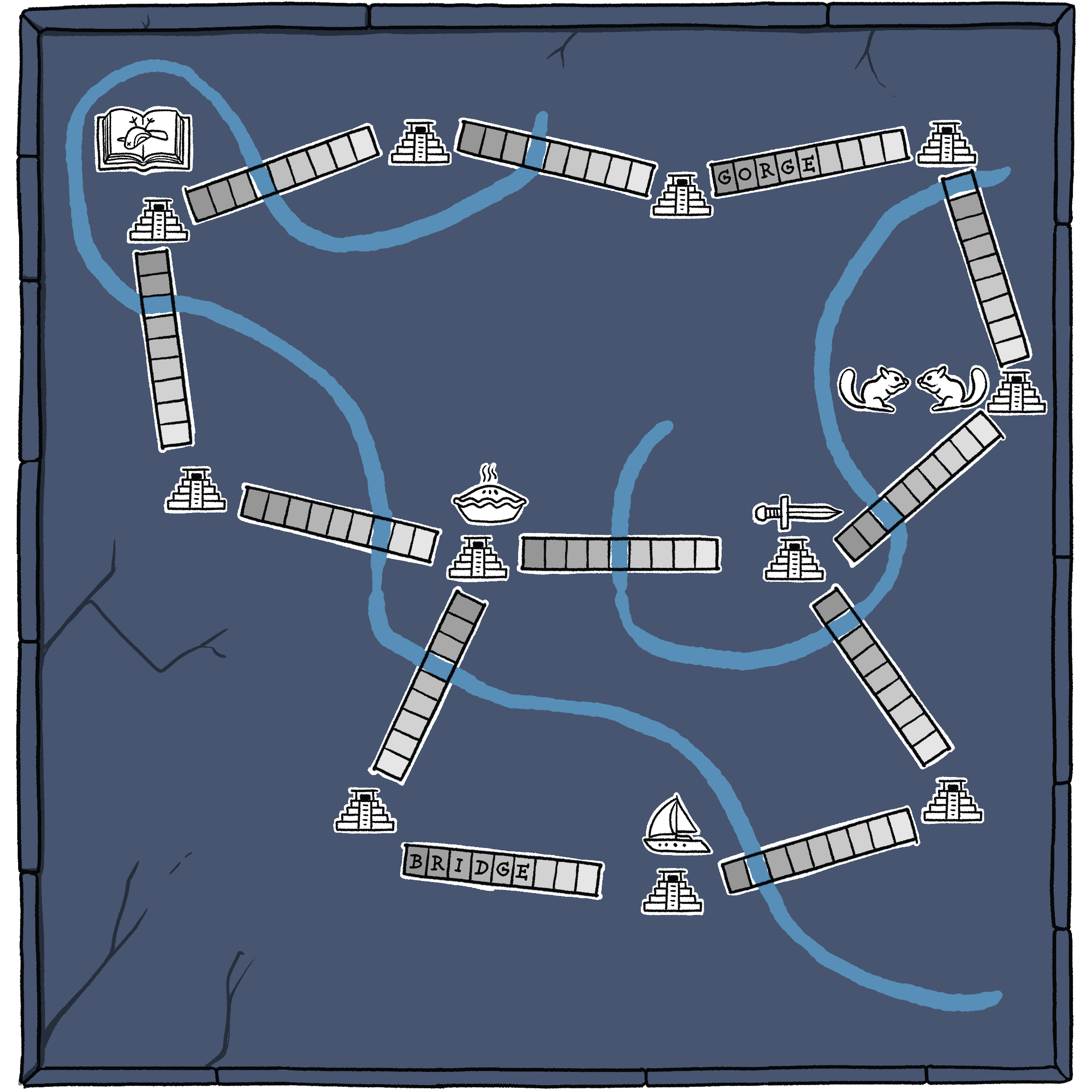 Outside the temple complex stands eleven monuments. The monuments display unusual carvings, though some are too faded to read. They are separated by deep gullies which can only be crossed by rope bridges; each bridge connects a pair of monuments in a sensible manner. A river winds its way through the gullies, under the bridges.